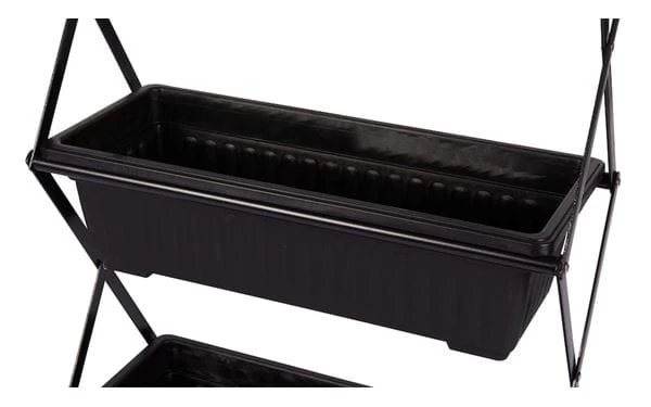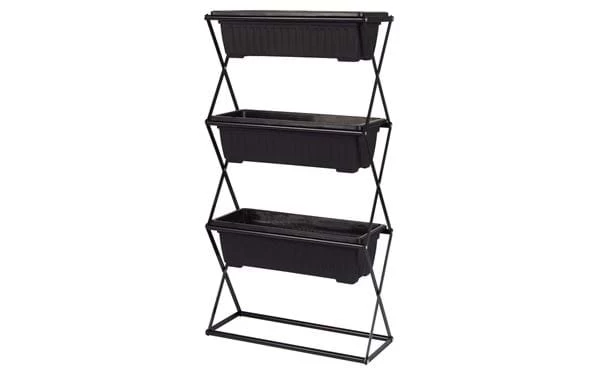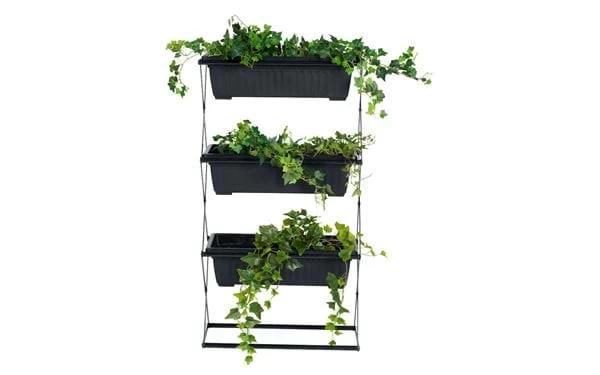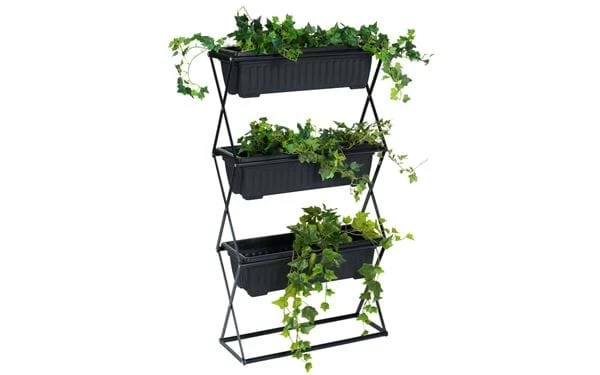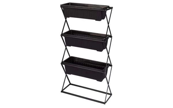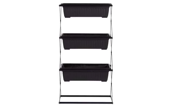 Zusammenklappbares Pflanzenregal mit drei abnehmbaren Blumenkästen. Gestell aus Stahl und Blumenkästen aus robustem Plastik.
