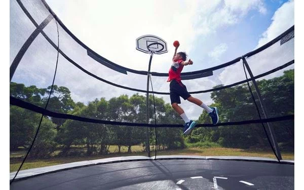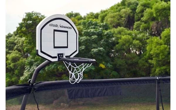 Mit einem Basketballkorb für das Trampolin kannst du Springen und gleichzeitig deine Zielgenauigkeit trainieren! Mit aufblasbarem Basketball und Pumpe. Passend für Rustas Trampoline Adrenalin Advanced in den Größen Ø 366 cm und Ø 426 cm, aber auch für andere Modelle mit einer Rahmenhöhe von 90 cm und einem Rahmenrohr Ø von 38,1–50 mm.
