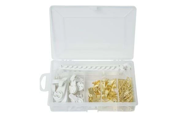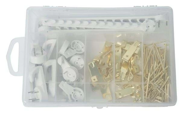 Inhalt: Aufhängeschiene 120×10 mm 5 Stck., Bilderhaken einfach 30×8 mm 15 Stck., Bilderhaken doppelt 30×20 mm 5 Stck., Betonhaken klein 30×12 mm 10 Stck., Betonhaken groß 40×20 mm 5 Stck., Messingnagel 26 mm 50 Stck., Messingnagel 40 mm 30 Stck.