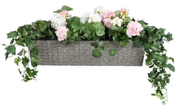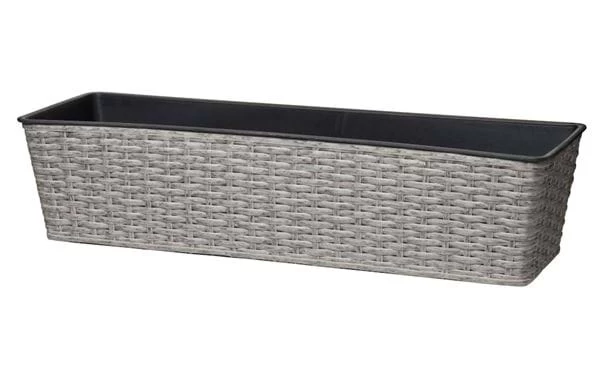 Frostbeständige Blumenkasten aus gebürstetem Kunstrattan mit einem Innentopf aus Plastik. Erhältlich in grau und schwarz.