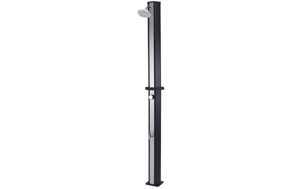Sonnen- und Gartendusche für alle Gelegenheiten, bei denen man im Garten eine warme Dusche genießen möchte. Praktisch nach dem Strandausflug oder vor und nach einem Bad im eigenen Pool. Die Dusche wird an den Gartenschlauch angeschlossen und das Wasser im 35-Liter-Tank von der Sonne erwärmt. Eingebauter Mischer zur Temperaturregelung und separater Wasserhahn für die Füße am Boden. Zweiteiliges Modell zur komfortablen Aufbewahrung in der kälteren Jahreszeit.