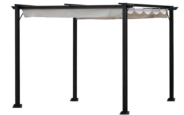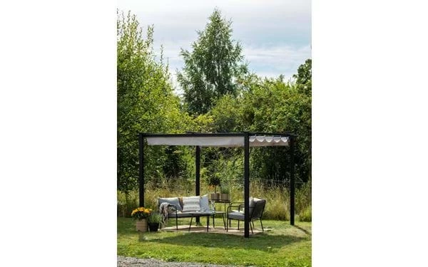 Der Gartenpavillon Rhodos ist ein flexibler Freisitz, mit dem du dir deine eigene Sommeroase gestalten kannst. Ein Pavillon bietet Platz, Schatten und Windschutz. Rhodos hat einen stabilen Rahmen aus schwarzem, pulverbeschichtetem Aluminium, ein Material, das sich besonders gut für Gartenmöbel eignet, da es nicht rostet. Sicherungsscheiben und Hülsen für Pfosten, aus pulverbeschichtetem und korrosionsbeständigem Stahl. Der Gartenpavillon hat eine strapazierfähige Dachbahn in Hellgrau aus PU- und UV-Schutz-beschichtetem Polyester. Das Dach hat Tragrohre, ist verstellbar und kann mit den mitgelieferten Bändern gesichert werden. Umfang Stange: 7,5×7,5 cm.