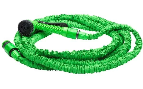 Dehnbarer Gartenschlauch aus Polyester und Latex als Alternative zu herkömmlichen Wasserschläuchen. Je nach Wasserdruck von 5–15 m ausdehnbar. Sprühdüse und Hahnverbindungsstück inbegriffen.