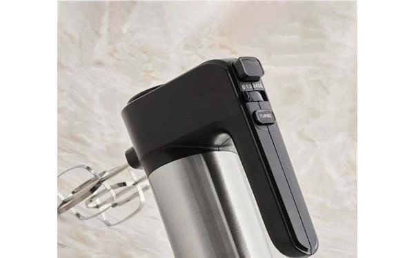 Handrührgerät mit 6 Geschwindigkeitsstufen und Turbofunktion. 2 Schneebesen und zwei Knethaken aus Edelstahl sind im Lieferumfang enthalten. Leistung 400W.