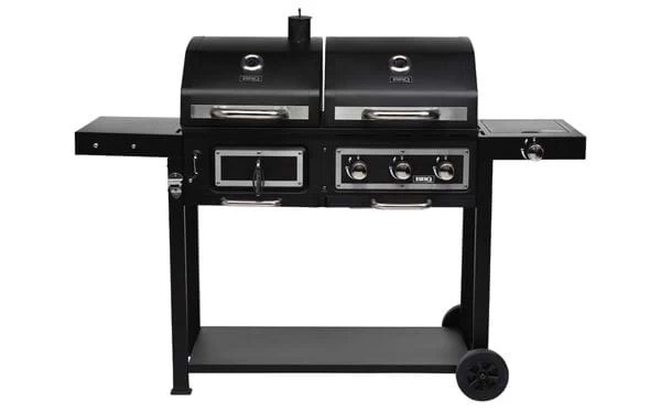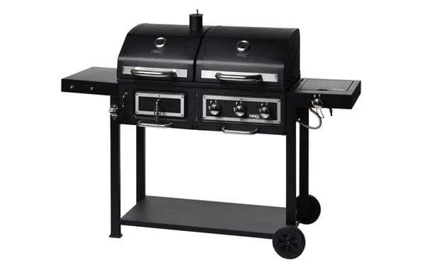 Kannst du dich nicht zwischen einem Holzkohlegrill und einem Gasgrill entscheiden? Keine Sorge, dieser Grill vereint das Beste aus beiden! Sowohl der Gas- als auch der Holzkohleteil haben stabile Gusseisenroste, die die Hitze besser halten und dem Grillgut schöne Streifen verleihen. Mit einer ausziehbaren Fettschale am Gasgrill und einem ausziehbarem Aschebehälter am Holzkohlegrill lässt sich dieser Kombigrill kinderleicht reinigen. Beide Grills können gleichzeitig verwendet werden – optimal für das Grillfest! Der Grill verfügt über 3+1-Brenner, die mit Ihrer automatischer Zündung einfach zu entzünden sind. Der Grill hat auch einen Seitenbrenner, mit dem du das Grillen mit einem Kochtopf oder einer Bratpfanne ergänzen kannst – koche Kartoffeln, während du das Fleisch grillst! Der Grill verfügt über praktische Abstellflächen und einen Flaschenöffner. Das integrierte Thermometer erlaubt eine ideale Kontrolle beim Zubereiten, damit dein Grillergebnis optimal wird. Zusätzlich erhältlich: Grillabdeckhaube L, um deinen Grill zu schützen, wenn er nicht verwendet wird.
