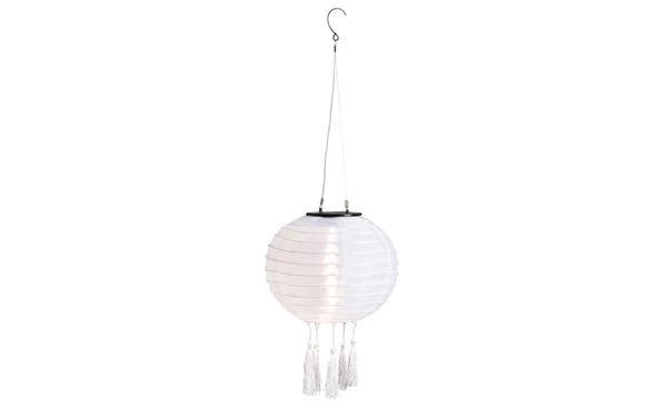 Solarbetriebene Reispapierlampe, die im Sonnenlicht tagsüber aufgeladen wird und in der Dunkelheit mit einem warmweißen Licht leuchtet.