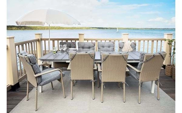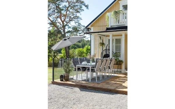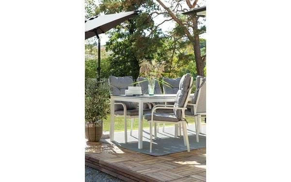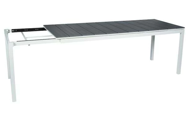 Barcelona ist ein stilvoller Tisch mit Platz für große Gesellschaften. Der Tisch ist ausziehbar. Durch die Zusatzplatte finden 6 oder 8 Personen Platz. Die Tischplatte besteht aus pflegeleichtem Kunstholz und der Ständer aus witterungsbeständigem Aluminium. Pulverbeschichtetes Aluminium ist ein leichtes Material, mit dem sich der Tisch mühelos bewegen lässt und das sich besonders gut für Möbel im Freien eignet, da es nicht rostet. Der Tisch ist in den Farben Schwarz oder Grau/Weiß erhältlich. Damit du eine komplette Essgruppe zusammenstellen kannst, kombiniere ihn mit unseren Stühlen und profitiere von unseren günstigen Paketpreisen mit 6 oder 8 Stühlen.