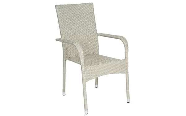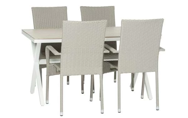 Möbelgarnitur für mittelgroße Balkone oder Terrassen. Tisch mit Platte aus pflegeleichtem Kunstrattan und Kreuzbein. Stapelbare Stühle aus pflegeleichtem Kunstrattan und Stahlrahmen.