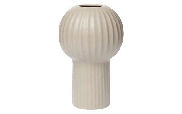 Die Vase Nova ist aus Keramik gefertigt und hat eine gerippte Oberfläche sowie eine abgerundete Form oben. Mit ihrer weichen Form wirkt sie ohne Blumen genauso schön wie mit Blumen.